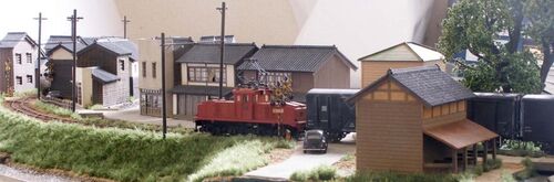 建物はまだ色入れしてませんでしたので、ペタペタとアクリルラッカーでつや消しに・・屋根瓦はフラットベース入れた黒だけですが、乾くと白い粉吹いたようになります。この後本当でしたら小物で活き活きとさせるのですが、まだ完成までは時間がかかります。…