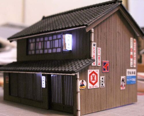 また少々追加でプリントしました。今回は通常の白い紙に出力に加え、透明シールなどにも まずは軒下に連続した状態。しかし、まだ何のお店だか決めてないのです・・・ こんなお店も。LEDも仕込んでみました。3Vでテスト点灯 ついでに看板も作りました。こち…